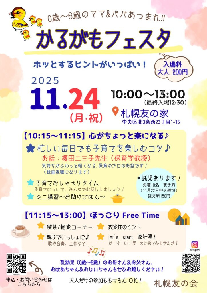 かるがもフェスタ 2025.10.28 お申込み・お問合せはこちらから ※すでにチケットをお持ちの方は「参加人数0人」と入力してください※ 必須 お名前 必須 メールアドレス 必須 お電話番号 必須 参加人数 大人人 必須 託児の申込 託児申込あり託児申込なし 任意 備考 入場料・託児料は当日受付でお支払いください ※申し込み後、2日経ってもこちらからの返信がない場合は、こちらまでご連絡ください